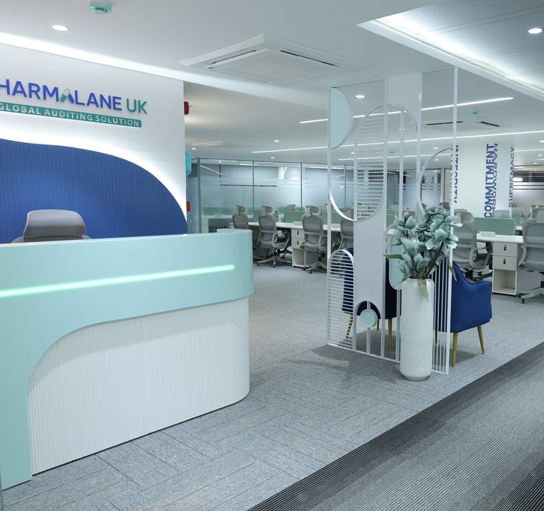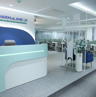 A reception desk with rich laminate background with fine details and a door beautifully hidden!